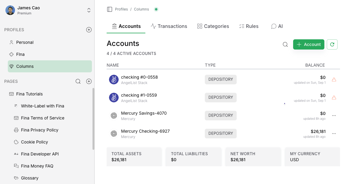 Flexibly organize accounts into different profiles, such as personal, family, and business. Each profile has its own independent tracking system, including categories and rules.